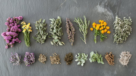 An appealing display of assorted dried herbs and flowers artfully arranged on a slate surface, perfect for culinary, decorative, or wellness purposes, showcasing vibrant colors and textures.
