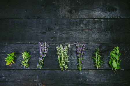 Various herbs picked from the garden, getting ready for drying, on wooden background