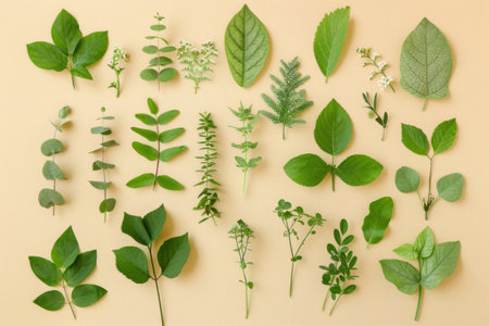 Various herbs and leaves arranged in a circle on a beige background natural beauty of botanicals displayed in circular arrangement