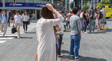 Tokyo, Japan - August 30, 2016: Japanese office workers and tourists crossing the road at pedestrian crossing