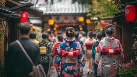 Vibrant kimonos complement serene tea ceremonies amid sakura blossoms and Zen gardens in Kyoto.