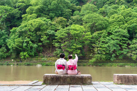 Kyoto / Japan - November 3, 2017: Pretty Japanese girls dressed in traditional kimonos, taking selfies at Kiyomizu-dera temple in Kyoto, Japan