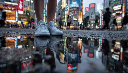 A person stands on a wet street, their shoes reflected in puddles amidst city lights.