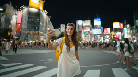 Young traveler taking selfie at crowded Shibuya crosswalk at night, urban travel lifestyle and social media content ideal for tourism campaigns, blogs and apps