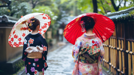A mesmerizing scene featuring traditional Japanese yukata and colorful umbrellas, showcasing the beauty and artistry of cultural festivals in a lively setting.