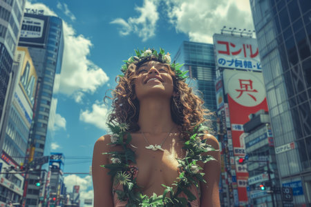 Young Woman Wearing Floral Wreath Smiling Blissfully in Vibrant Urban Setting with Bright Blue Sky and Cityscape AI Generative