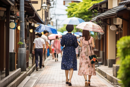 Tokyo, Japan - August 10, 2016: Modern japanese girls in traditional kimono on the way to the temple, Asakusa district