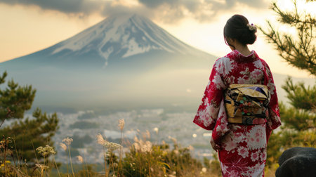 A geisha walks through Kawaguchiko. Japanese girl in a kimono against the background of lake Kawaguchiko and mount Fuji. Japanese woman admiring nature. Business card of Japan. Autumn in Kawaguchiko.
