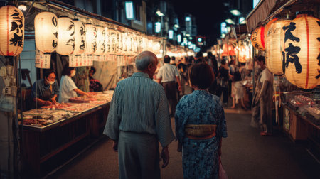Senior couple dressed in traditional Japanese garments walks through a vibrant night market filled with glowing lanterns, food vendors and crowds, capturing a warm and authentic moment