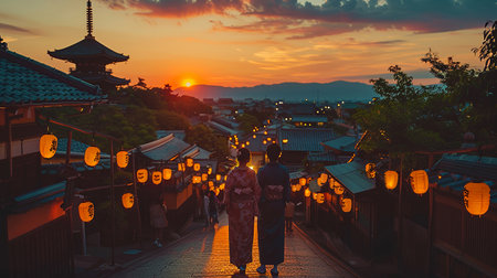 Dusk pedestrians on stone lane in Kyoto Higashiyama near Ninenzaka