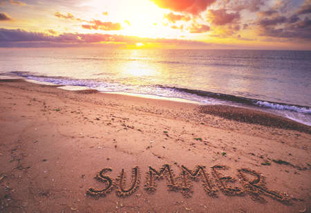 Seascape in the summertime. The word Summer on the beach sand. Inscription Summer on the seashore