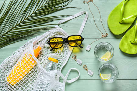 Beach accessories. Various creams, glasses, hat and towel with sea shells on a colored background. Top view. Flat Lay.