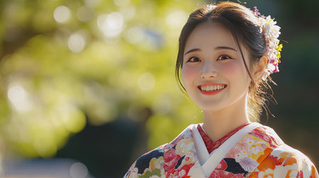 A cheerful young woman wearing a vibrant pink kimono adorned with floral patterns stands against a softly blurred natural background. Her radiant smile and delicate flower in her hair evoke a sense of joy and cultural beauty, celebrating tradition and femininity.