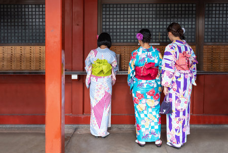 Tokyo, Japan - August 10, 2016: Modern japanese girls in traditional kimono on the way to the temple, Asakusa district