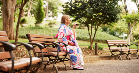Asian woman, park bench and communication with phone for voice message, conversation or vocal audio in nature. Japan, female person or tourist with mobile smartphone, speaker or kimono for chat app