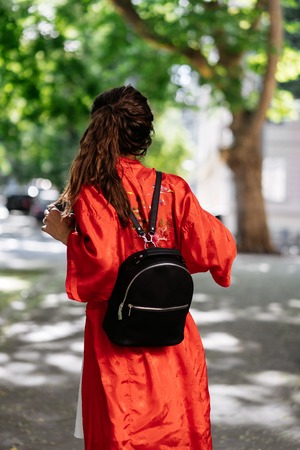 portrait of Asian woman wearing bright patterned dress walking in the street. ai generated