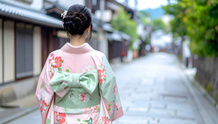A rear view of a woman with her hair styled and adorned with flowers, wearing a beautiful light pink and green floral kimono with a large bow, walking down a traditional Japanese street with blurred buildings. High quality photo