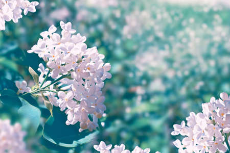 Spring blooming lilac flowers branch, vintage nature background.