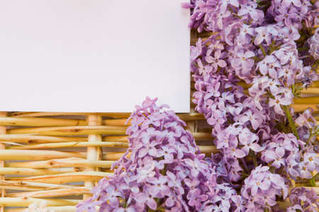 Lilac flowers on pink paper. Floral greeting card with space for text. Purple lilac border top view, stylish beautiful spring image. Happy mothers day and Womens day concept.
