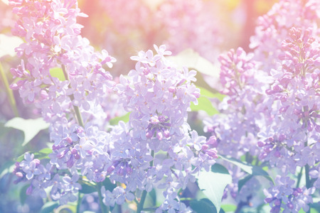 Bunch of blooming lilac flowers vintage close up photo.