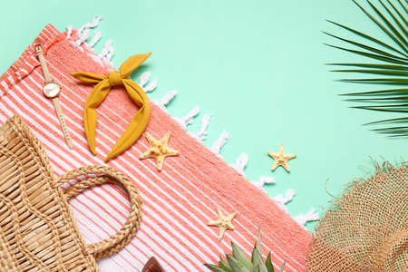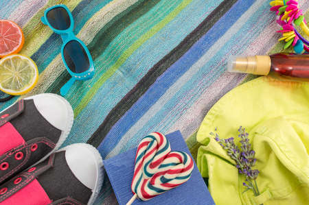 Summer vacation concept flat lay. beach accessories and towel top view. Space for text. travel concept.