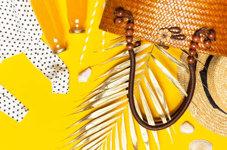 Summer background Beach accessories. Beach wicker straw rattan women's eco bag white dress hat golden tropical leaf juice in glass jars straws shells starfish on yellow background. Flat lay top view.