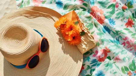 Summer vacation concept flat lay. straw hat beach accessories and towel top view. Space for text. travel concept.
