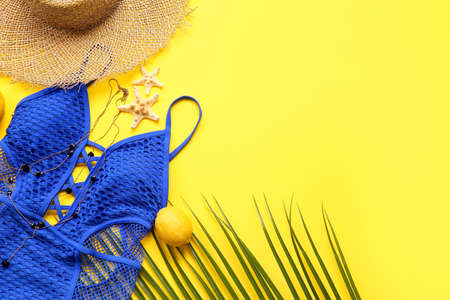 Summer vacation concept, travel. Beach accessories and stuff on a yellow background. Studio shot. Flat lay