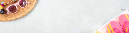 Summer beach, sea vacation accessories web banner with straw hat, flip flops and sunglasses on stone