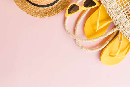 Summer fashion background on pink, trendy straw bag, fedora hat, leather sandals and yellow sunglasses, flat lay, top view, selective focus