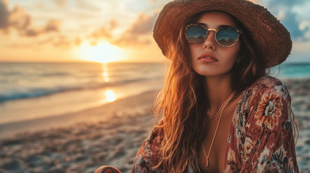 Young woman relaxing on the beach at sunset, wearing sunglasses and a straw hat, showcasing calm ocean waves and vibrant colors