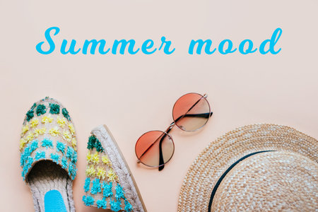 Summer fashion flatlay with espadrille sandals, gradient round sunglasses and straw hat on the beige background. Perfect beach set for holidays on the sea. Marina style.