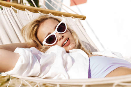 Image of charming blonde woman wearing sunglasses lying in hammock on summer beach