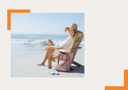 Photograph of caucasian woman sitting on a chair smiling at the beach against grey background. summer holiday and vacation concept