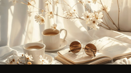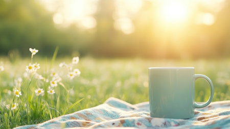 A mug on blanket in sunny field with daisies, evoking peaceful morning