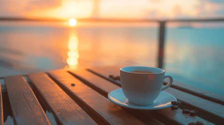 Two cups of coffee sit on a wooden table, with cushions in the foreground and the ocean and sky visible. The scene is bathed in soft, warm light, suggesting either sunrise or sunset. This image could be used for lifestyle, travel, or relaxation-themed projects.