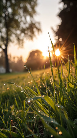 Captured at sunrise, this image showcases morning dew clinging to fresh green grass, illuminated by soft sunlight, creating a serene and vibrant outdoor atmosphere.