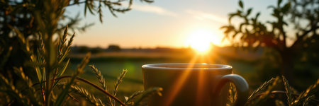 Morning sunlight illuminates a steaming cup of coffee surrounded by greenery at sunrise in a serene landscape