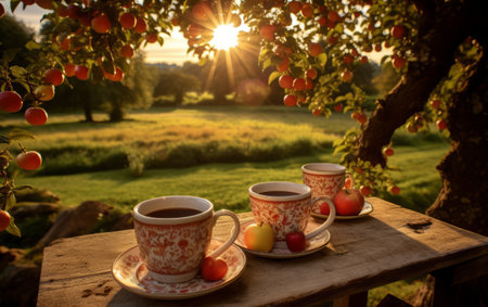 Two cups of coffee on a wooden table in an apple orchard