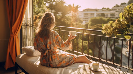 Attractive girl with long hair in pajama having breakfast on balcony in the morning in city She holds a cup reading on tablet : Generative AI