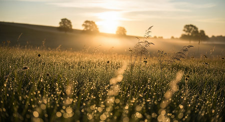 The soft, golden light of a sunrise illuminates a meadow filled with dew-kissed grass and delicate wildflowers. Countless water droplets on the blades of grass sparkle like tiny diamonds, creating a magical bokeh effect. The background is softly blurred, with hazy trees and hills silhouetted against the bright sky. The scene is bathed in warm, ethereal light, conveying a sense of peace, tranquility, and the gentle awakening of nature in the early morning.