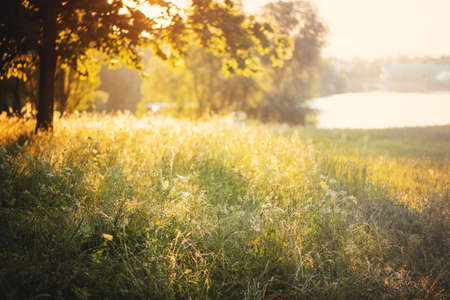 Bright green grass and trees in summer park with sunset light.