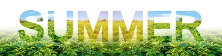 The inscription summer on the background of eggplants plantation. Winter crops. Season of the year, active phase of growing, harvesting. Time to stock up on vitamins, improve your health. Vacations