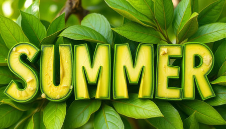 The word SUMMER carved out of avocado flesh, placed against a backdrop of vibrant green leaves, symbolizing freshness and nature