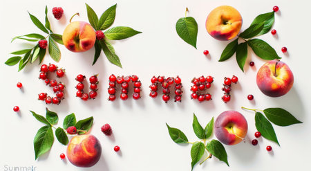 Vegetable banner with Summer written in fresh produce. Top view showcases green peppers, cherry tomatoes, red onions, eggplant, garlic leaves, lettuce, and yellow bell peppers on a white background.