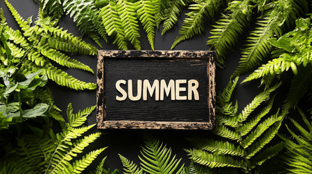 Rustic Summer Sign with Ferns, Natures Greeting, Seasons Background, Summertime Vibe
