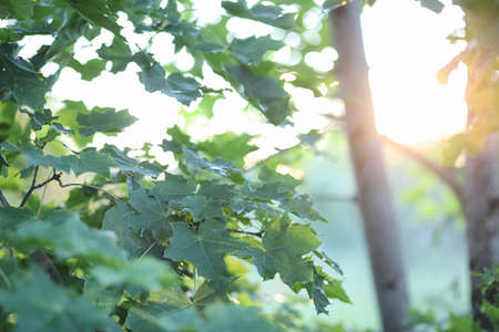 Vivid leaves of trees on bokeh background. Rich greenery in sunlight with copy space. Lush foliage close-up in sunny day. Natural green backdrop of scenic nature in backlight. Abstract texture.