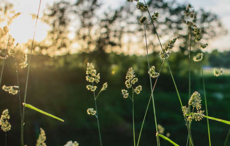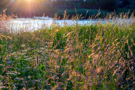 sunset on the river in summer green grass sun rays through tree branches