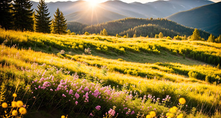 A wildflower meadow daisy grass mountain summer nature landscape sunrise outdoor green wildflower meadow with daisy flower and tall grass near mountain forest summer sunrise, peaceful nature