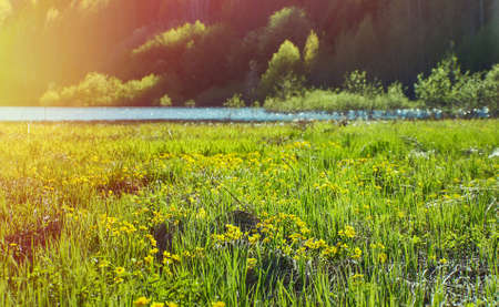 Spring meadow with flowers Caltha rhizomatous perennial flowering plants in the family Ranunculaceae